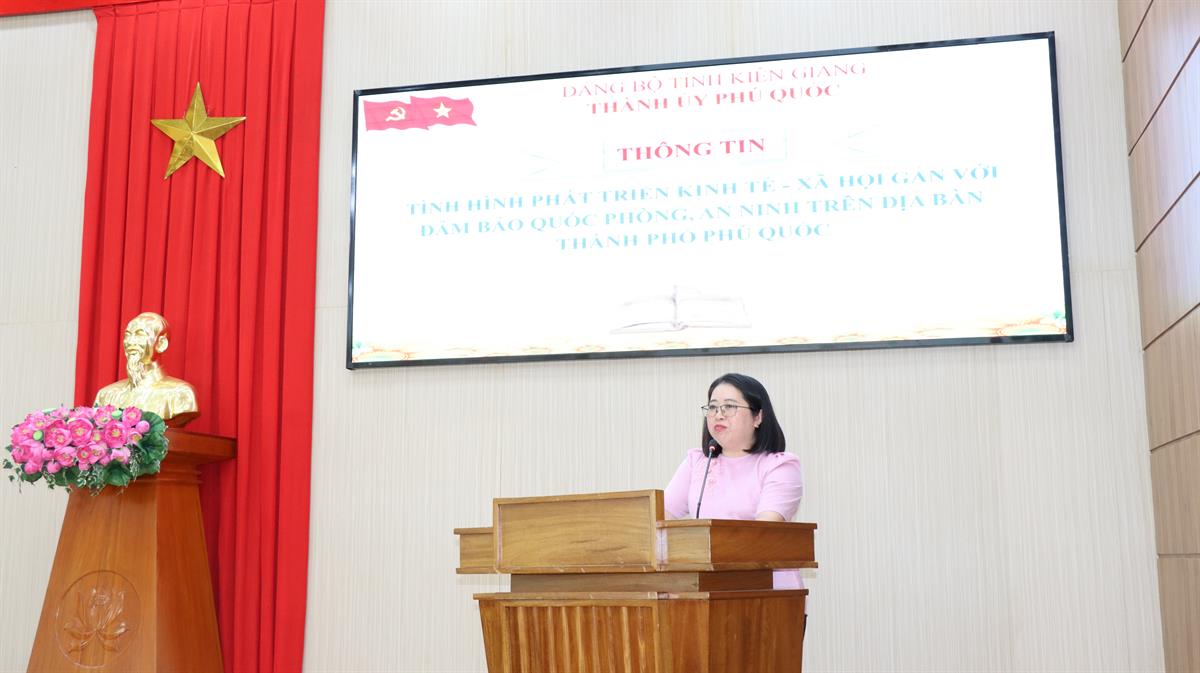 Đồng chí Đặng Thị Hồng Gấm - Ủy viên Ban Thường vụ, Trưởng Ban Tuyên giáo & Dân vận Thành ủy, Giám đốc Trung tâm Chính trị thành phố Phú Quốc thông tin tình hình phát triển kinh tế - xã hội của địa phương