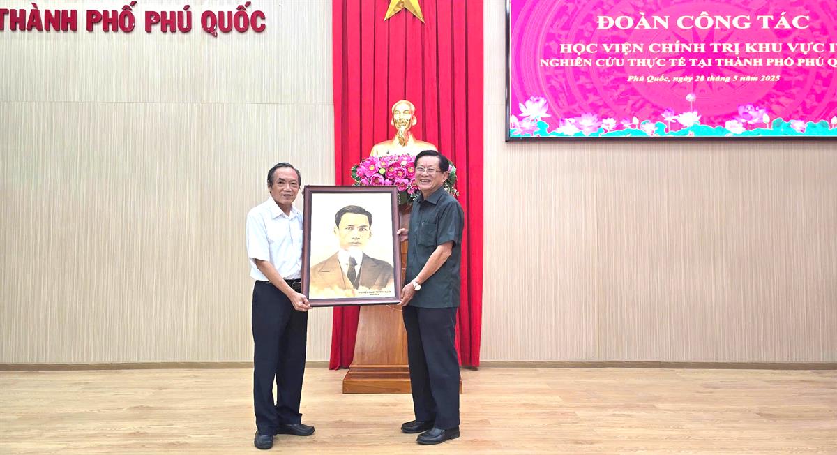 NGƯT,TS. Huỳnh Thanh Quang - Phó Bí thư Đảng ủy, Phó Giám đốc Học viện (trái) tặng tranh Chủ tịch Hồ Chí Minh cho Thành ủy Phú Quốc