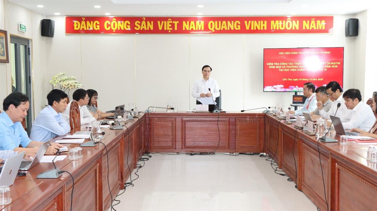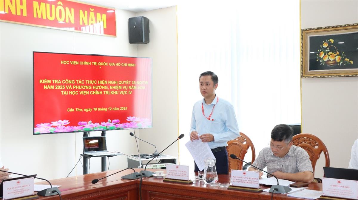 (HCMA4) – Sáng ngày 10/12/2025, tại thành phố Cần Thơ, Học viện Chính trị quốc gia Hồ Chí Minh tổ chức đoàn công tác kiểm tra việc thực hiện Nghị quyết số 35-NQ/TW ngày 22/10/2018 của Bộ Chính trị về “Tăng cường bảo vệ nền tảng tư tưởng của Đảng, đấu tranh phản bác các quan điểm sai trái, thù địch trong tình hình mới” tại Học viện Chính trị khu vực IV.
