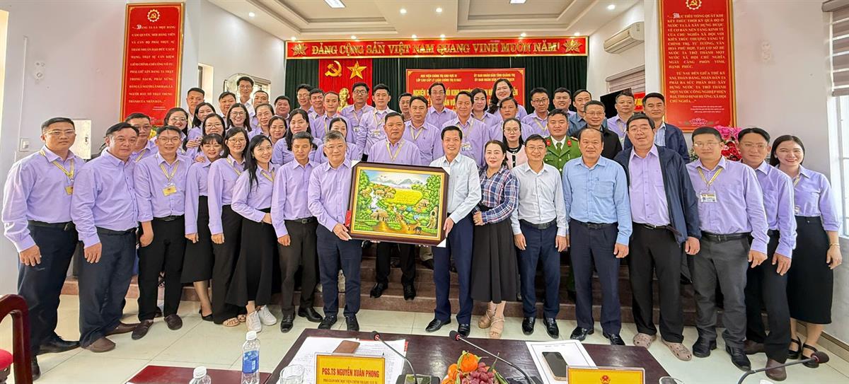 Trong hành trình, Đoàn công tác đã đến làm việc tại xã Phú Trạch, tỉnh Quảng Trị. Đón tiếp và làm việc với Đoàn có đồng chí Nguyễn Văn Minh - Phó Bí thư Thường trực Đảng ủy xã cùng các đồng chí trong Thường trực và lãnh đạo địa phương. Tại buổi làm việc, Đoàn đã nghe báo cáo khái quát về tình hình phát triển kinh tế - xã hội, công tác xây dựng Đảng và hệ thống chính trị của xã năm 2025; chỉ ra những thành tựu đạt được, những khó khăn, hạn chế, đồng thời xác định rõ phương hướng, mục tiêu và nhiệm vụ trọng tâm năm 2026. Không dừng lại ở việc tiếp nhận thông tin, các học viên trong Đoàn đã tích cực trao đổi, đặt nhiều câu hỏi sát với thực tiễn cơ sở; cùng thảo luận về những vấn đề đang đặt ra trong quá trình lãnh đạo, quản lý, tổ chức thực hiện nhiệm vụ chính trị tại địa phương. Trên tinh thần chia sẻ, trách nhiệm và xây dựng, Đoàn công tác đã cùng lãnh đạo xã phân tích những khó khăn, vướng mắc, gợi mở các giải pháp phù hợp với điều kiện thực tiễn, qua đó góp phần làm sáng rõ hơn quan hệ biện chứng giữa lý luận và thực tiễn trong công tác xây dựng Đảng và quản lý xã hội ở cơ sở. Trong khuôn khổ buổi làm việc, Đoàn công tác đã trao tặng 10 suất học bổng cùng quà tặng là sách, vở học tập cho các em học sinh có hoàn cảnh khó khăn nhưng nỗ lực vươn lên, đạt thành tích tốt trong học tập. Đây không chỉ là món quà vật chất, mà còn là sự sẻ chia ân tình, thể hiện trách nhiệm xã hội và tinh thần nhân văn của Học viện đối với thế hệ tương lai của đất nước. Trước khi kết thúc buổi làm việc, Đoàn công tác và lãnh đạo xã Phú Trạch đã trao tặng nhau những phần quà lưu niệm, thắm đượm nghĩa tình, ghi dấu một cuộc gặp gỡ chân thành và nhiều ý nghĩa.