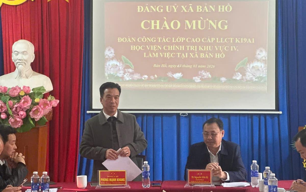 (HCMA4) - Chiều ngày 13/01/2026, Đoàn nghiên cứu thực tế lớp Cao cấp lý luận chính trị K19A1 do TS Nguyễn Văn Sỹ - Phó Bí thư Đảng ủy, Phó Giám đốc Học viện Chính trị khu vực IV làm Trưởng đoàn đã có buổi làm việc với Ủy ban nhân dân xã Bản Hồ, tỉnh Lào Cai. Tiếp và làm việc với Đoàn có đồng chí Phùng Mạnh Khang - Bí thư Đảng ủy xã, cùng đại diện Ủy ban Mặt trận Tổ quốc xã và các ban, ngành liên quan.
