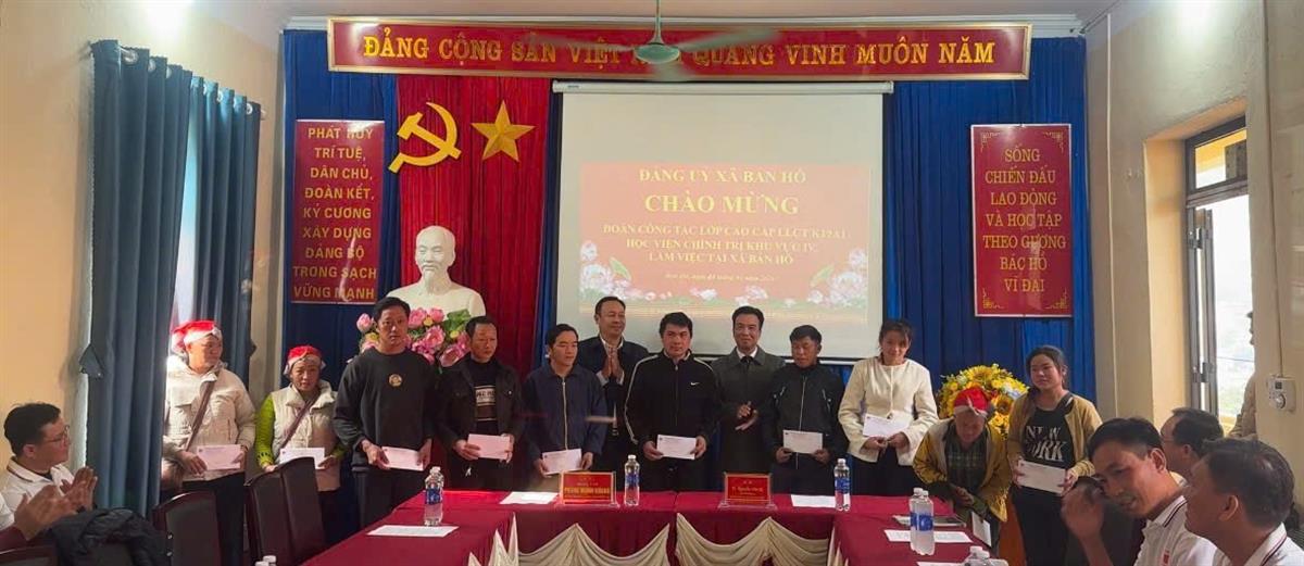 Nhân dịp này, Đoàn nghiên cứu thực tế lớp Cao cấp lý luận chính trị K19A1 đã trao tặng 20 suất quà cho các hộ đồng bào dân tộc thiểu số thuộc diện hộ nghèo, cận nghèo trên địa bàn xã Bản Hồ. Những phần quà thể hiện sự sẻ chia, tinh thần trách nhiệm xã hội của tập thể lớp, góp phần động viên các hộ dân đón Tết, vui Xuân thêm ấm áp, nghĩa tình.