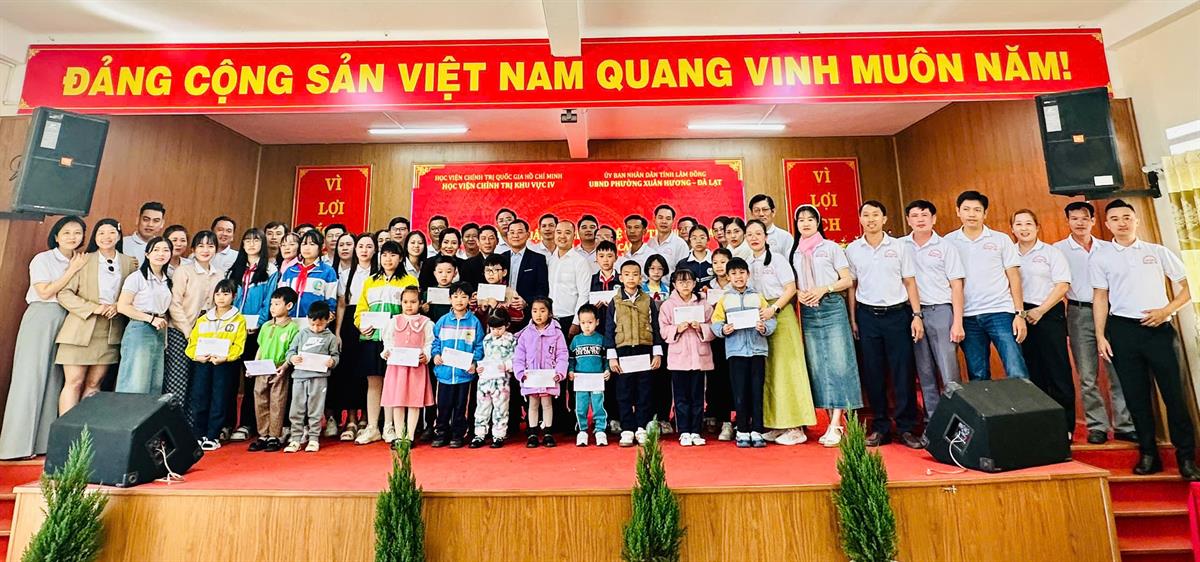Đoàn nghiên cứu thực tế lớp Cao cấp lý luận chính trị K19A2 chụp ảnh lưu niệm cùng báo cáo viên và các em học sinh buổi trao tặng học bổng cho các em học sinh có hoàn cảnh khó khăn trên địa bàn phường Xuân Hương, tỉnh Lâm Đồng