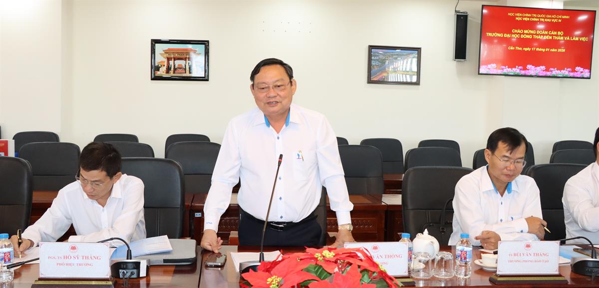 Phát biểu tại buổi làm việc, PGS, TS. Hồ Văn Thống - Bí thư Đảng ủy, Hiệu trưởng Trường Đại học Đồng Tháp cảm ơn sự đón tiếp trọng thị của Học viện Chính trị khu vực IV, đồng thời khẳng định Trường Đại học Đồng Tháp luôn coi trọng và sẵn sàng mở rộng hợp tác với Học viện trên các lĩnh vực phù hợp với chức năng, nhiệm vụ của hai bên.