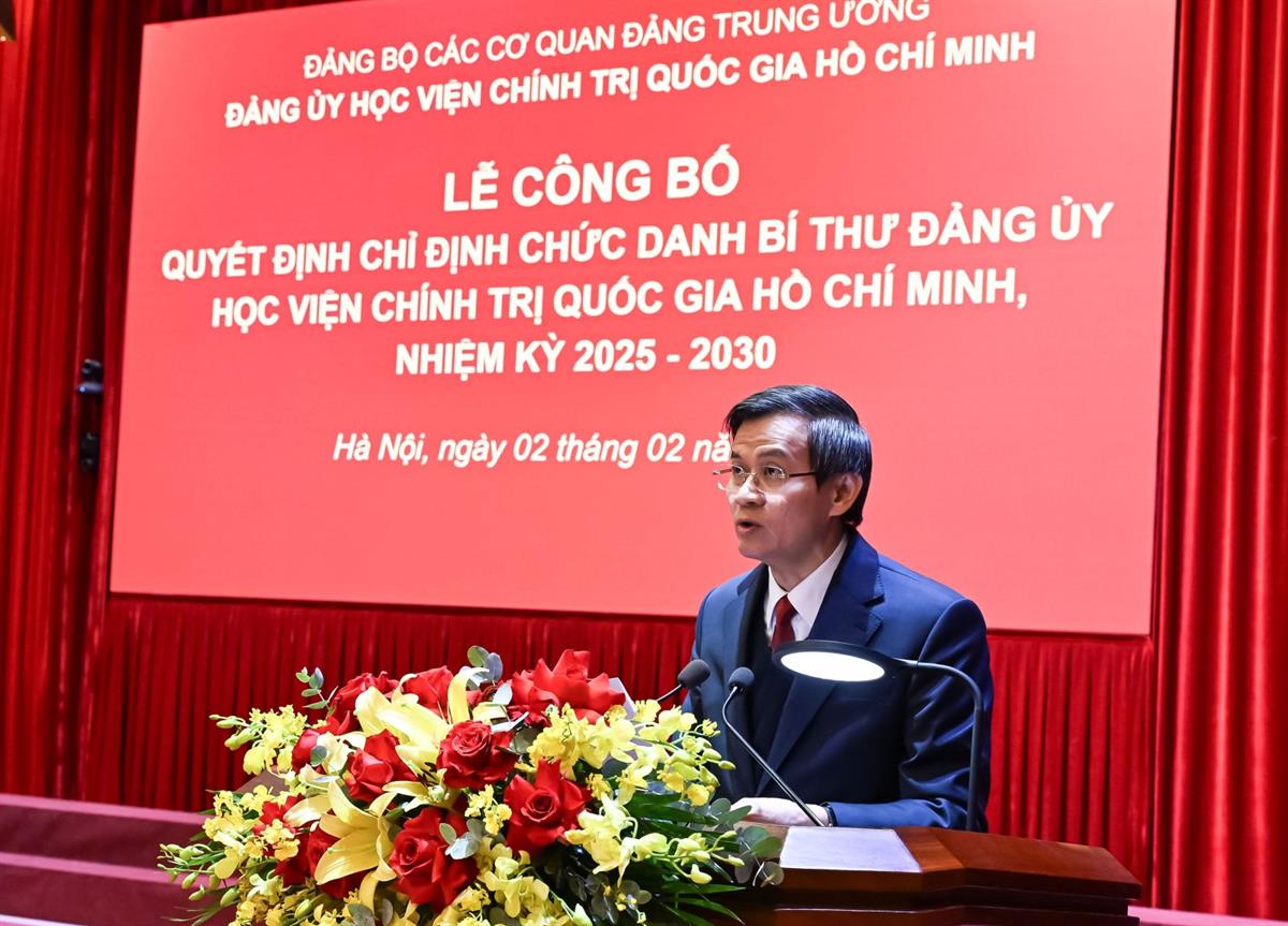 Tại buổi lễ, đồng chí Nguyễn Đức Minh, Phó Trưởng ban Thường trực Ban Tổ chức Đảng ủy các cơ quan Đảng Trung ương, công bố Quyết định của Đảng ủy các cơ quan Đảng Trung ương chỉ định đồng chí Đoàn Minh Huấn, Ủy viên Bộ Chính trị, Giám đốc Học viện Chính trị Quốc gia Hồ Chí Minh giữ chức Bí thư Đảng ủy Học viện Chính trị Quốc gia Hồ Chí Minh, nhiệm kỳ 2025-2030.