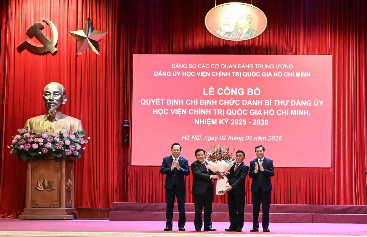 (HCMA4) - Chiều 02/02/2026, Đảng ủy Học viện Chính trị Quốc gia Hồ Chí Minh tổ chức Lễ công bố Quyết định chỉ định chức danh Bí thư Đảng ủy Học viện Chính trị Quốc gia Hồ Chí Minh, nhiệm kỳ 2025-2030. Đồng chí Trần Cẩm Tú, Ủy viên Bộ Chính trị, Thường trực Ban Bí thư, Bí thư Đảng ủy các cơ quan Đảng Trung ương dự và chủ trì buổi lễ.