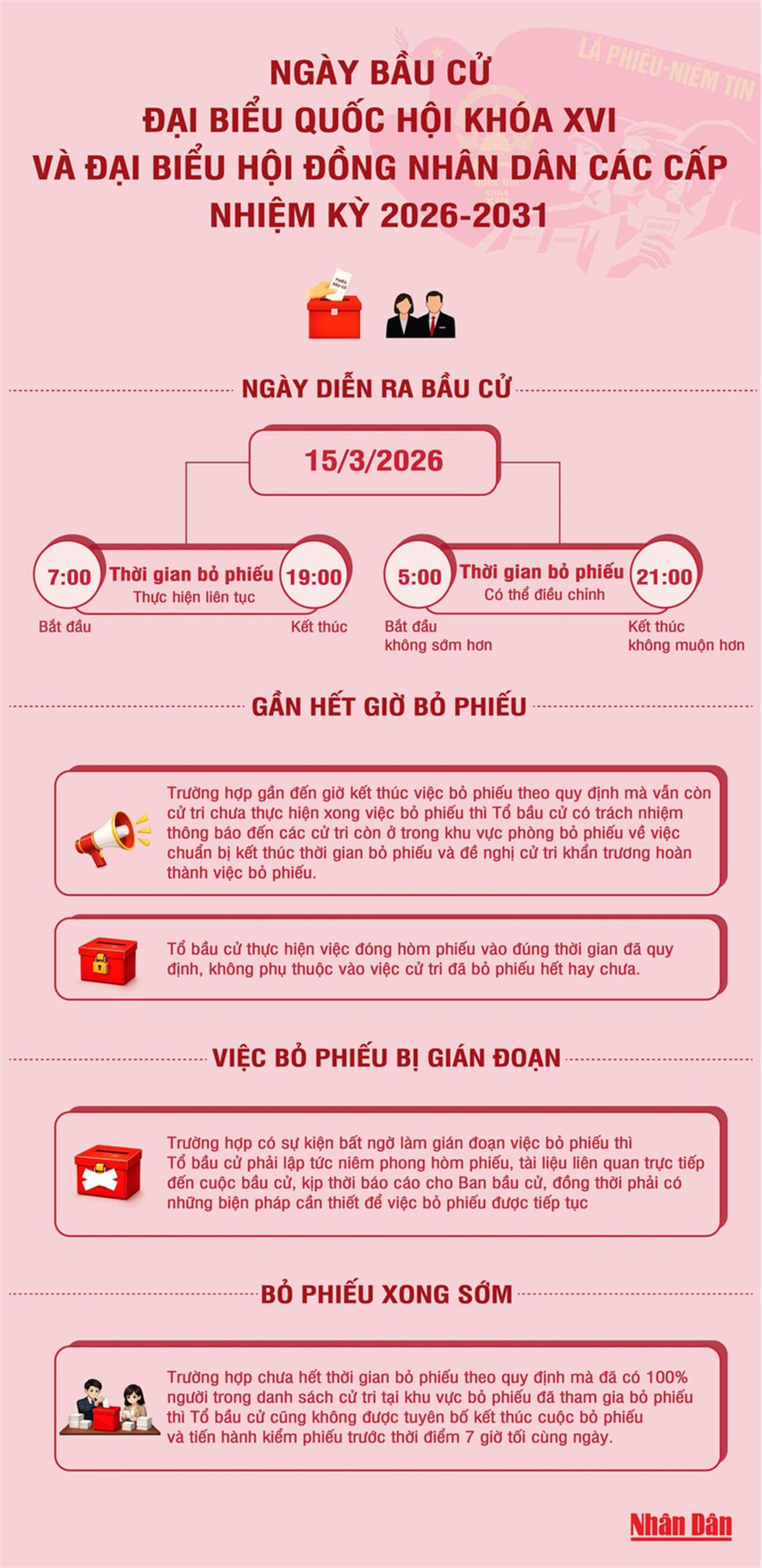 Ngày Bầu cử đại biểu Quốc hội khóa XVI và đại biểu Hội đồng nhân dân các cấp nhiệm kỳ 2026 - 2031 là Chủ nhật, ngày 15/3/2026. Việc bỏ phiếu sẽ được bắt đầu từ 7 giờ sáng và thực hiện liên tục cho đến 7 giờ tối cùng ngày.