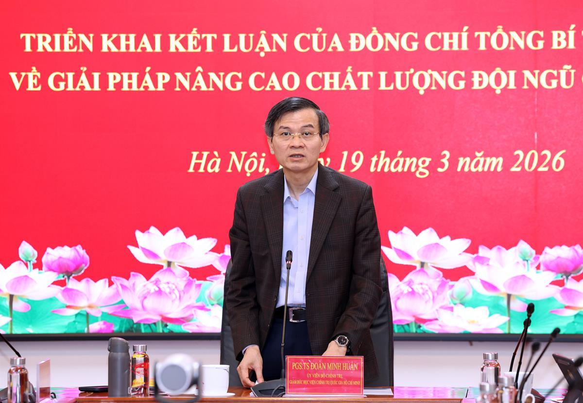 (HCMA4) - Sáng ngày 19/03/2026, Học viện Chính trị quốc gia Hồ Chí Minh tổ chức Hội nghị triển khai Kết luận của đồng chí Tổng Bí thư Tô Lâm về giải pháp nâng cao chất lượng đội ngũ cán bộ cơ sở. PGS, TS. Đoàn Minh Huấn, Ủy viên Bộ Chính trị, Giám đốc Học viện Chính trị quốc gia Hồ Chí Minh dự và chủ trì hội nghị.