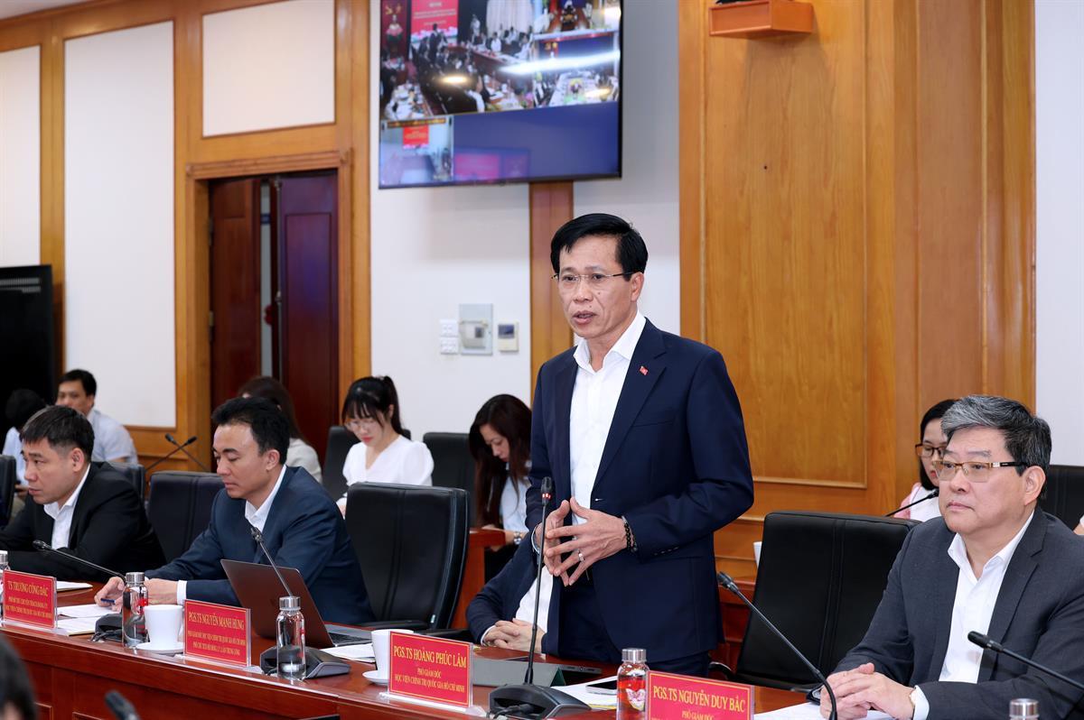 Tại hội nghị, PGS, TS. Nguyễn Duy Bắc, Phó Giám đốc Học viện báo cáo dự thảo Kế hoạch thực hiện Kết luận của đồng chí Tổng Bí thư Tô Lâm tại Thông báo số 21-TB/VPTW ngày 07/3/2026 của Văn phòng Trung ương Đảng về giải pháp nâng cao chất lượng đội ngũ cán bộ cơ sở. Đồng chí cho biết, dự thảo Kế hoạch được xây dựng trên cơ sở quán triệt các nghị quyết, kết luận của Trung ương, Bộ Chính trị, Ban Bí thư về công tác cán bộ; đồng thời bám sát yêu cầu đổi mới tổ chức bộ máy, xây dựng chính quyền địa phương hai cấp, đẩy mạnh cải cách hành chính, chuyển đổi số và nâng cao chất lượng phục vụ nhân dân trong giai đoạn phát triển mới.